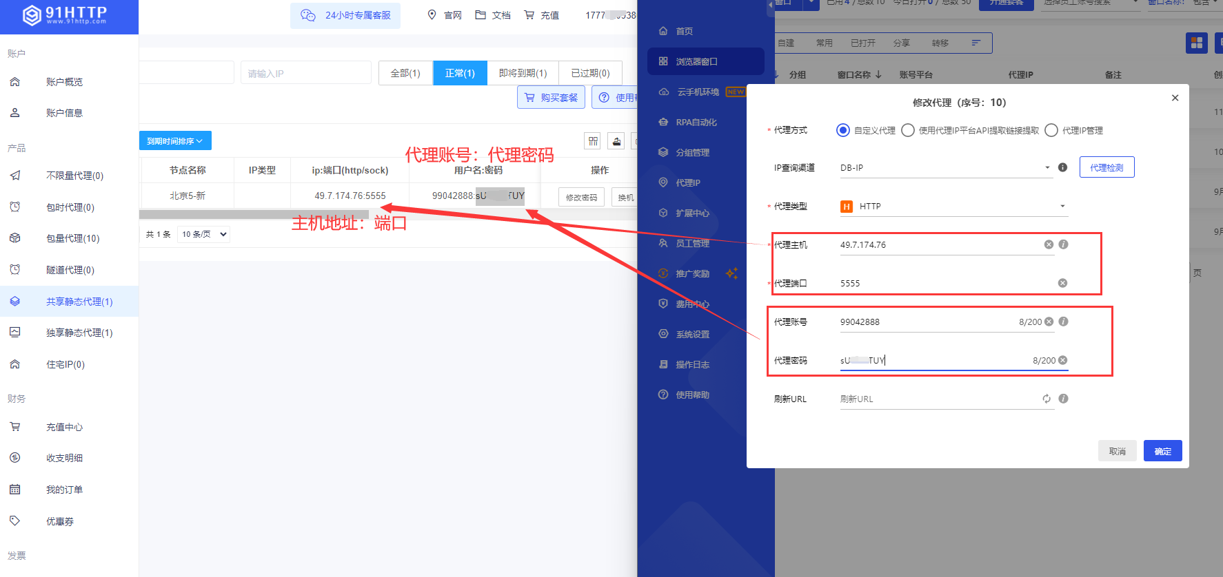 注:"代理方式"选择"自定义代理","代理类型"根据自己需求选择,"代理主机"为第一步图中"ip","代理端口"为第一步图中"端口","代理账号"为第一步图中"用户名","代理密码"为第一步图中"密码"