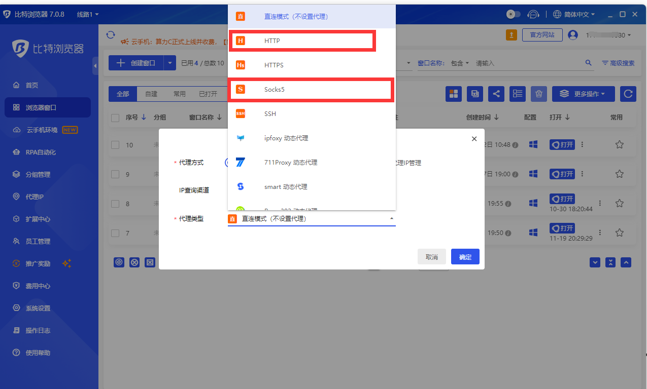 第四步:点击代理协议类型,选择“HTTP/Socks5”