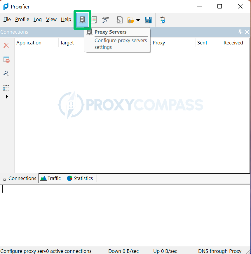 单击代理服务器图标(如下图所示)或单击菜单项“轮廓”然后“代理服务器...“。”.
